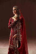 A classic AMMARA KHAN red, created into an old worldly gharara and kameez, with exquisite gold zardozi and resham handwork. The dupatta is adorned with beautiful and bold scalloped borders with heavily embellished pallus with a resham chatta patti. Hours and hours of intricately crafted worksmanship by our artisans are behind each bridal creation.