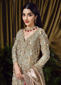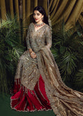 This is three piece garment. The long shirt and dupatta are made out of pure tissue while the elaborate sharara is curated from age old technique of chatta Patti with two colours of satin silk. The garment is fully embellished giving it a rich and traditional vibe.