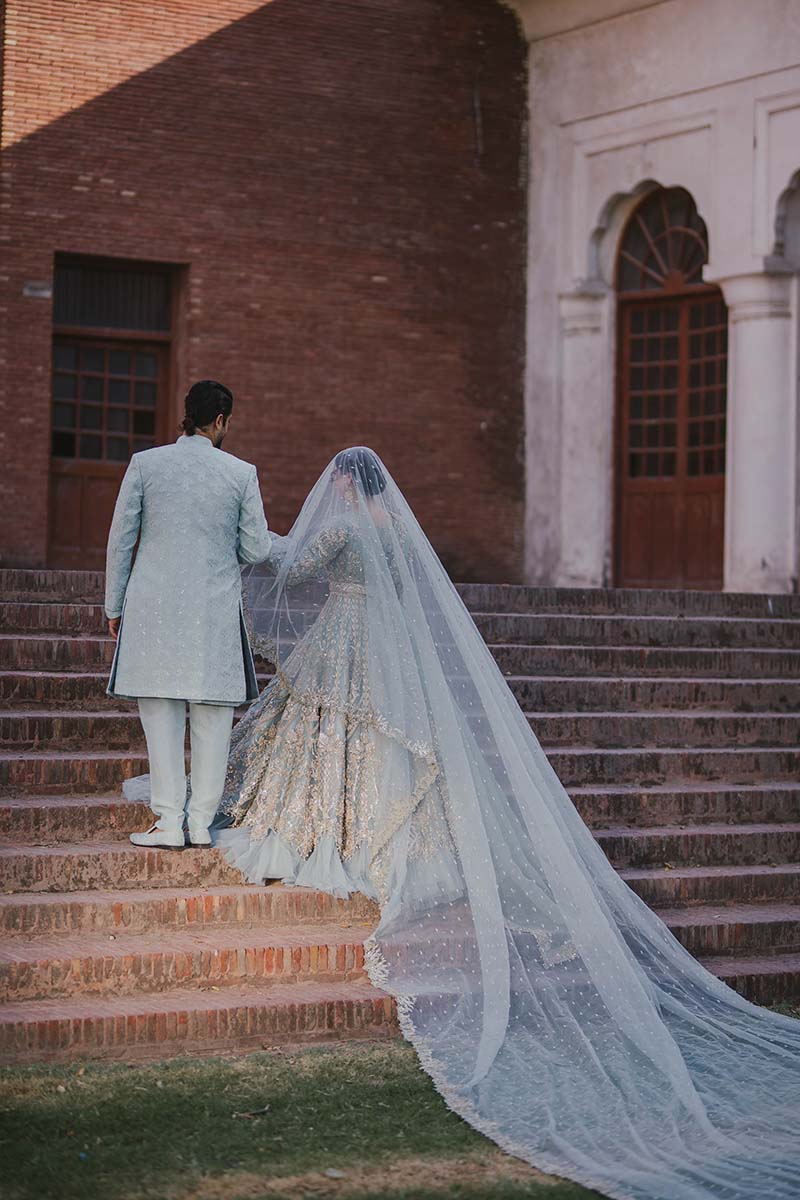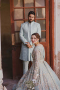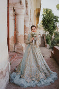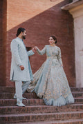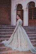 Ice-blue organza pishwas and duppata paired with tissue lehnga(Net frills attached at the bottom) Embellished with golden and silver mix tones.