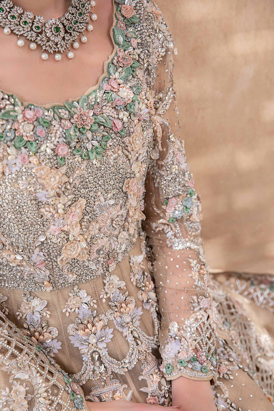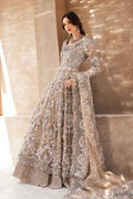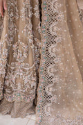 LUNARA' is our contemporary classic Gown Set crafted to perfection in nude peach organza. It achieves a glistening dewy look with an exquisite composition of embroidery motifs adorned with intricate details of ribbon, diamantes, sequins, pearls, crystals, dabka & naqshi work so you can radiate joy & confidence.