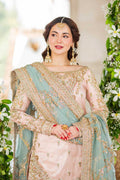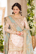 Pastel pink Raw Silk knee length Shirt and Sharara paired with pure organza dupatta is beautifully enhanced with mixed medium hand embellishments.