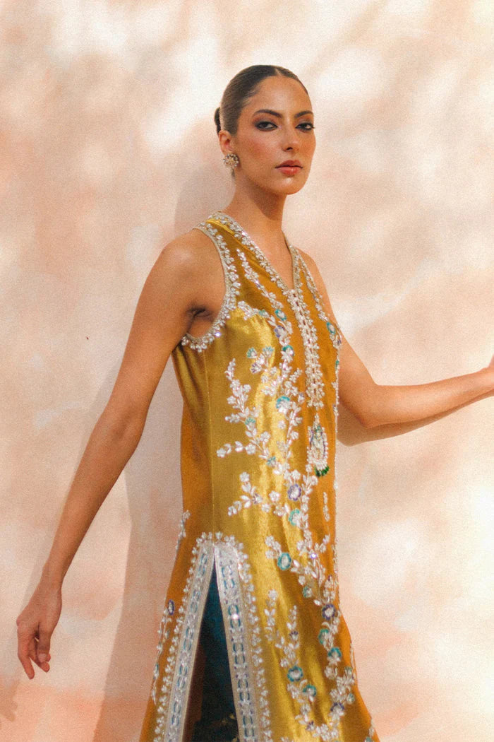 A meticulously crafted golden tissue shirt with zardoze detailing in hints of turquoise and lilac is the ideal option for your summertime festivities. It comes with a pair of lilac rawsilk pants that feature intricate cutwork details.