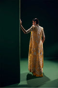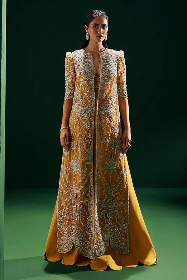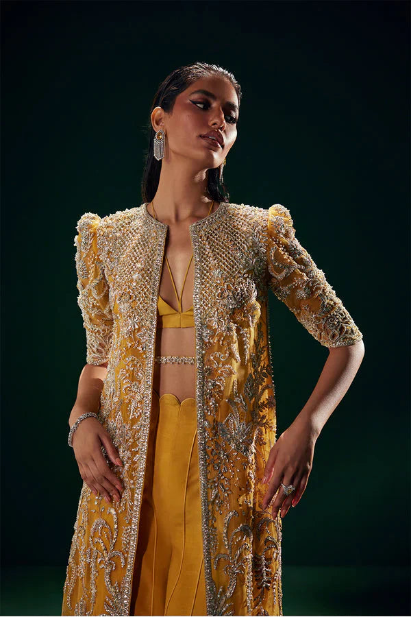 Monarch is a captivating net Tuscany saffron long jacket, featuring puffed mid-length sleeves and a delicate scalloped hem. The jacket features dabka work and corresponding seesha work in an overlaying floral layout. It is elegantly paired with intricately raw silk paneled scalloped trousers, creating a graceful and captivating Design.