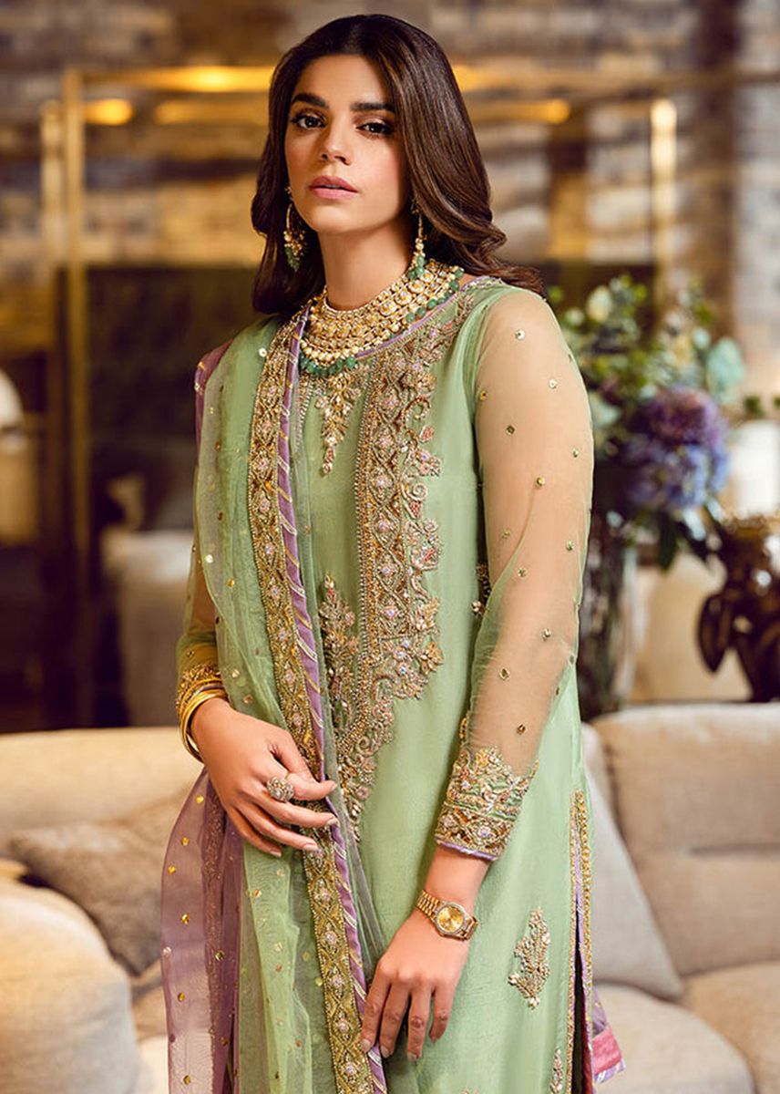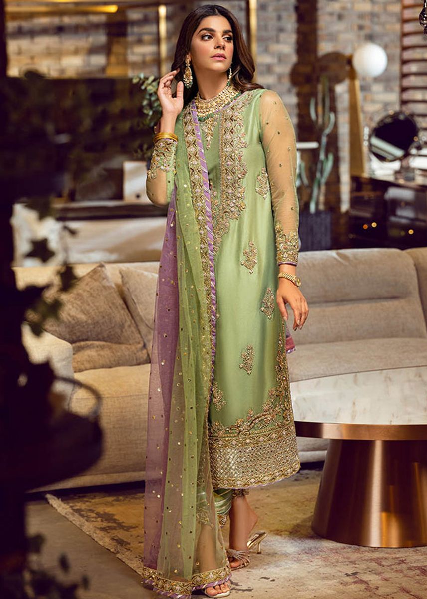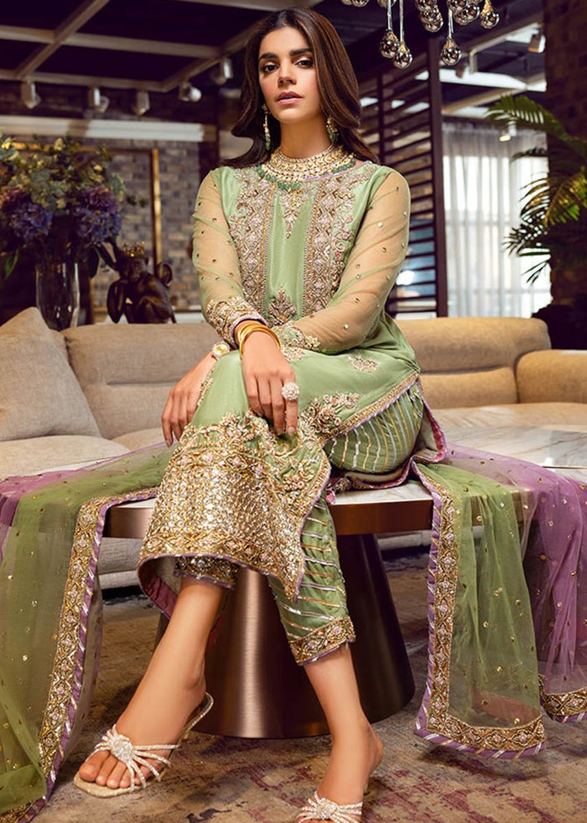 This breathtaking combination of pista green and lavender amalgamates in a unique way making it a must have outfit. To enhance the style quotient artistic embellishments are sprawled throughout the shirt and net dupatta. The look is completed with gotta work on the pantgiving it a timeless vibe.