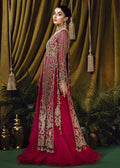 A modern take on traditional wedding wear. The three piece outfit is made out of net. The shirt is fully embellishment front and back skillfully placed over an underdress completing an A line silhouette. Further a net dupaata embellished with scallop borders and line patterns is added to complete the look.