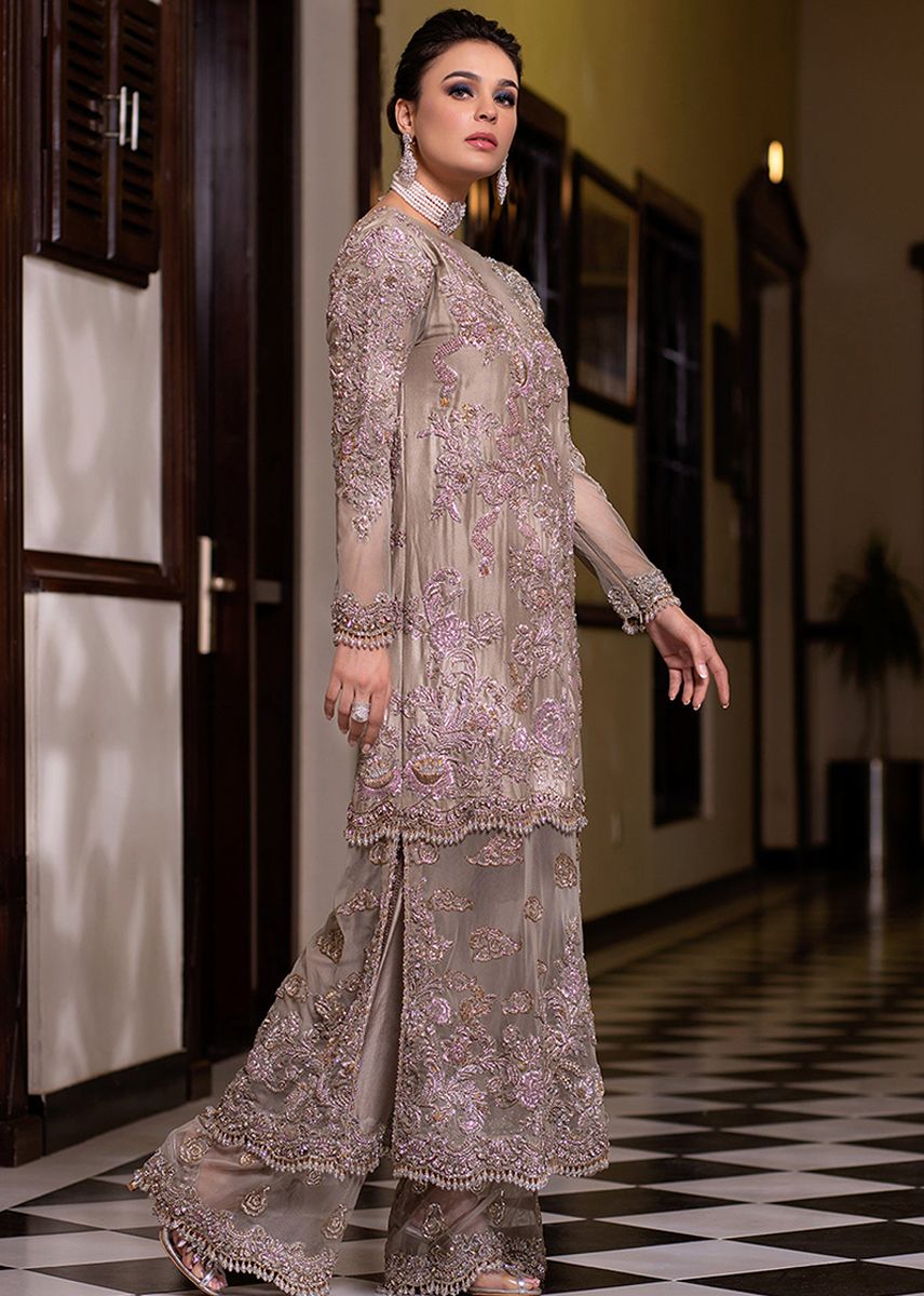 This Oat brown luminous dress is perfectly curated with a Tila floral work on net straight shirt and trouser. Designed with bead tassels well rounded on this exquisite apparel.