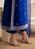 Indulge in regal sophistication with our Royal Blue Ensemble! This pure raw silk straight shirt is adorned with intricate, colorful embroidery and hand embellishments, meticulously crafted to match your unique style. Paired effortlessly with culotte pants for a contemporary twist, and complemented by an embellished organza dupatta, this ensemble is a vision of timeless beauty and individuality. Immerse yourself in the majestic charm of our captivating creation, designed to make you feel like royalty with every wear.