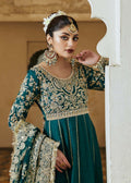 Elegance meets tradition in this exquisite long bottle green Pishwas ensemble, a timeless piece that exudes grace and sophistication. The Pishwas, with its floor-length silhouette, beautifully drapes the wearer in rich, verdant hues, creating a regal and captivating presence. The meticulously composed embroidery adorning the outfit adds a touch of opulence, showcasing intricate patterns that seamlessly blend tradition with modern aesthetics.Paired with a matching Churidaar Pijama, the ensemble ensures a harmonious flow from top to bottom,To complete this ensemble, organza dupatta adorned with complementary embroidery adds the perfect finishing touch.