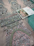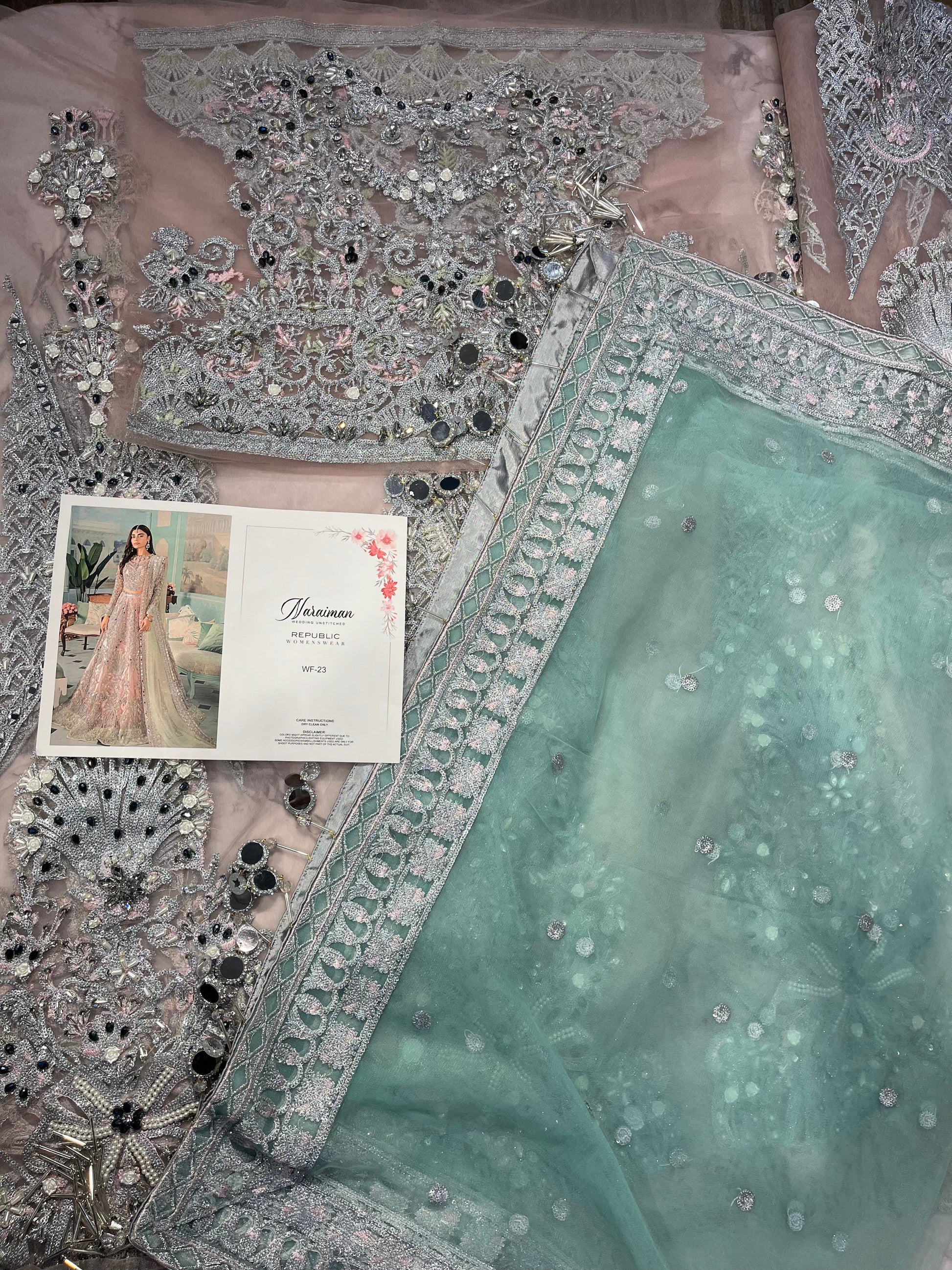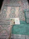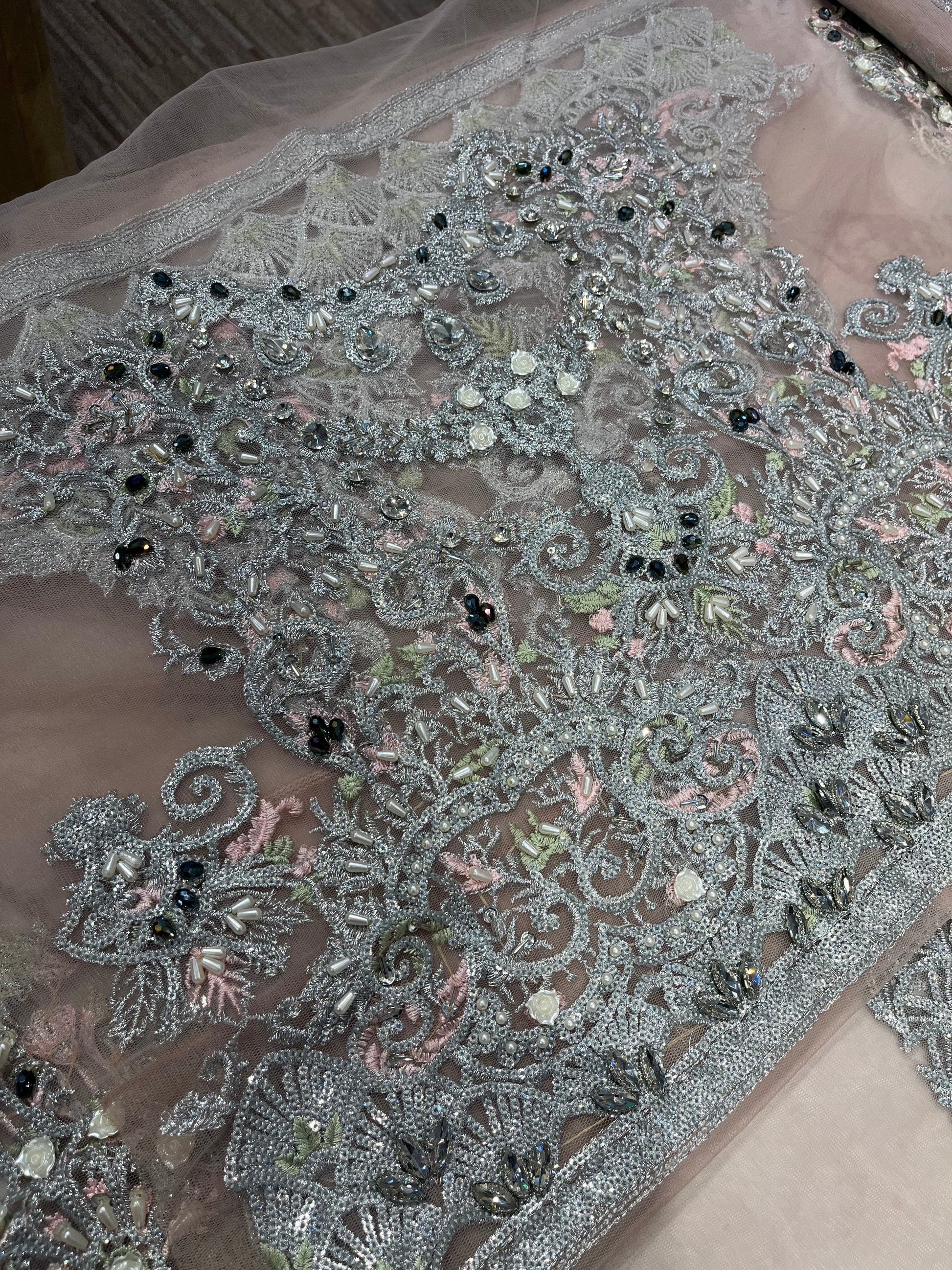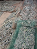 This majestic Lehnga Choli is beautifully crafted with dabka, nakshi, kora, swarovski, crystals, pearls, mukesh, sheesha and various other embellishments. Fabric used is tulle and tissue in enchanting pinks and muted mint green!